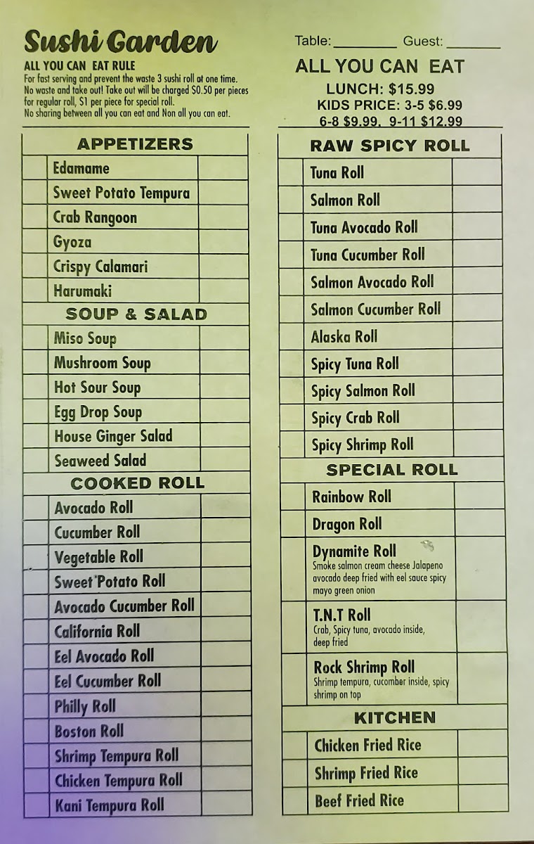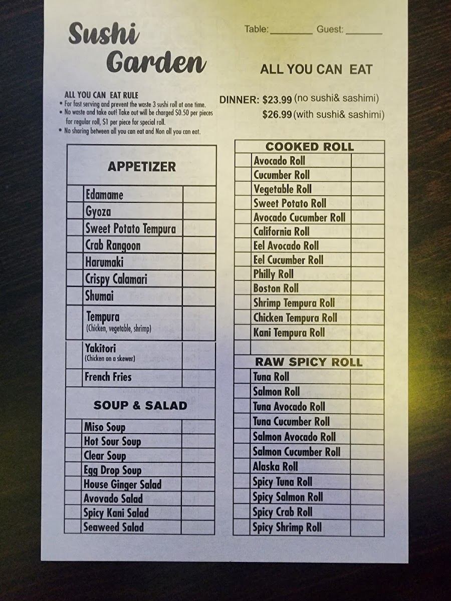 Finally, the Hibachi Side Orders are a great addition for anyone looking to customize their meal further, with options such as Steak, Chicken, Shrimp, and Fried Rice. Whether you’re looking for a light lunch or a hearty dinner, Sushi Garden’s menu is designed to satisfy a wide range of tastes with generous portions and high-quality ingredients.